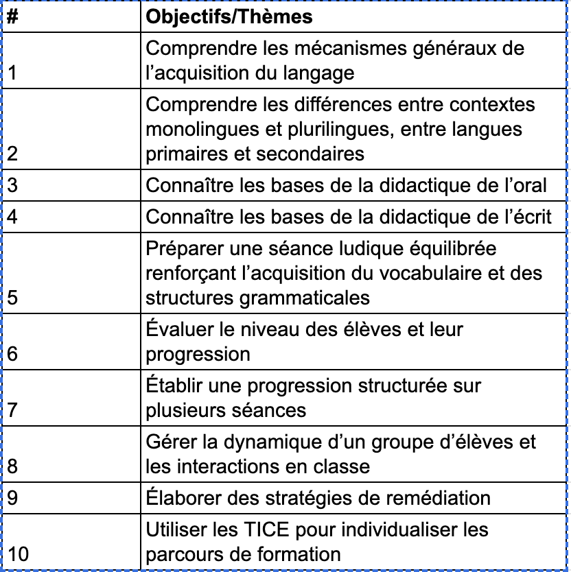 Phase 1 : La formation théorique des enseignants stagiaires se déroulera du mois d’octobre 2025 au mois de mai 2026. Elle comportera 10 séances en ligne de 60mn ainsi que des séances d’observation en personne.